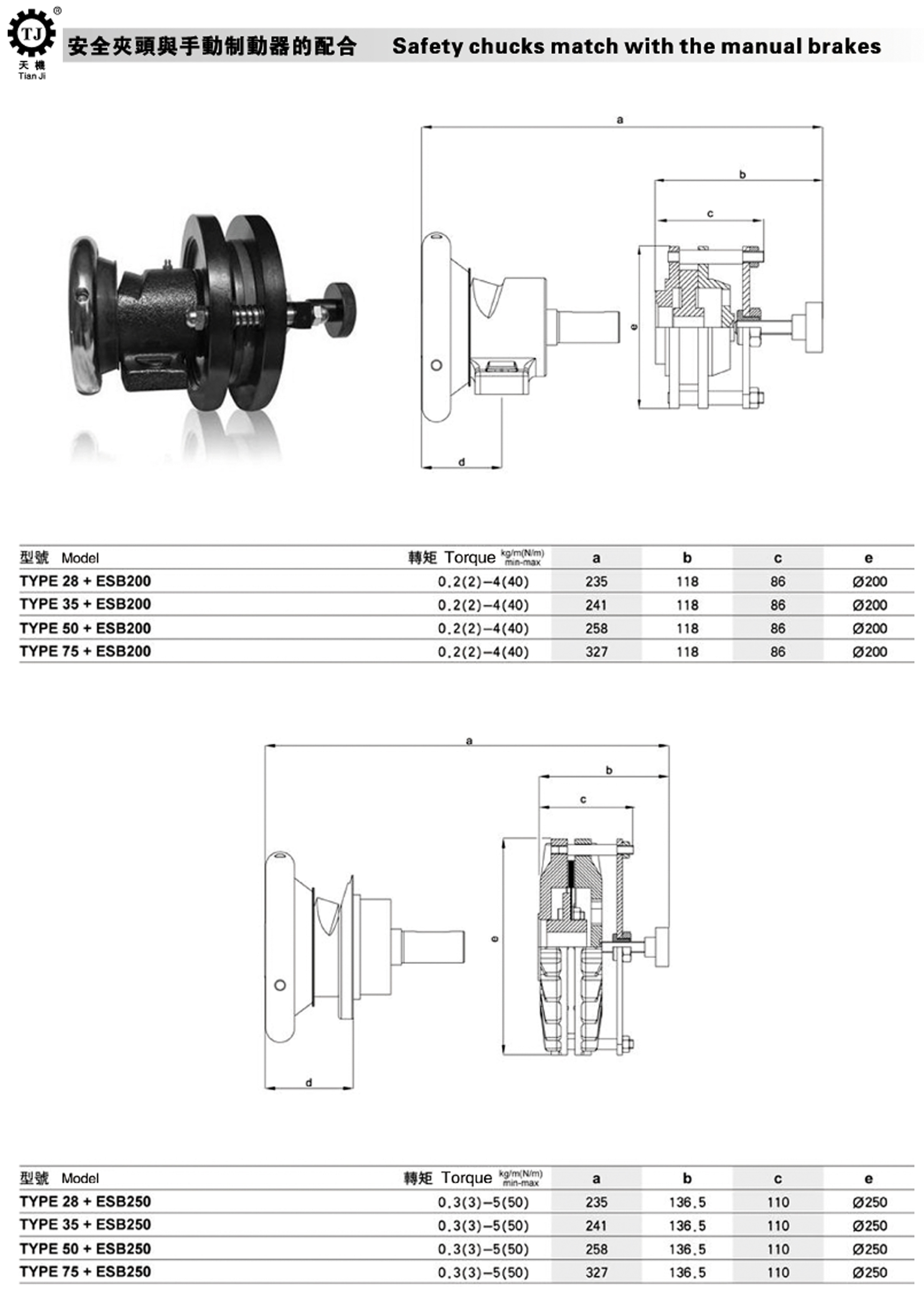 安全夹头刹车器分为卧式安装及立式安装。标准型安全夹头简单实用且容易安装的设计,为联结传动及脱离之类频繁动作提供快速、安全、确实及简易的联轴及脱离运作。而且,安全夹头传动部份的规格尺寸可依据不同的机械规格及特性而设计制造。