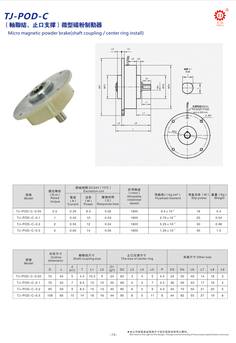 POD-C微型轴式磁粉制动器的选型一般以所需传达最大转矩为依据来选定,并同时注意保证实际滑差功率小于磁粉离合器、制动器的允许滑差功率。 磁粉制动器是由传动单元(输入轴)和从动单元(输出轴)合并而成。磁粉制动器是一种性能优越的自动控制元件。