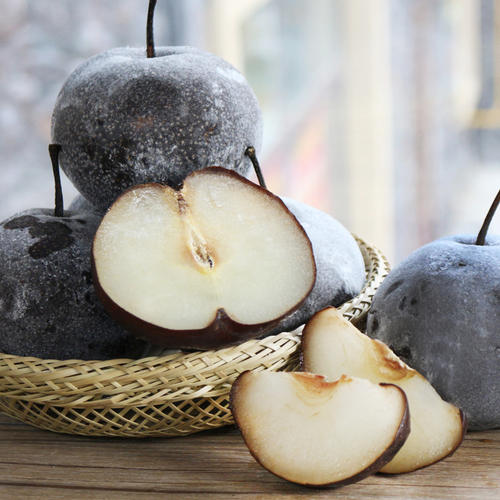 北方冻梨是寒冬赠与的甜品。把新鲜的梨子随手放在气温最低能达到零下三四十度的室外冻上一夜,经过一夜的“雪打风吹”裹着一层霜雪的冻梨就做好了。想吃冻梨的时候,把冻的像石头一样的梨子在室温下用凉开水浸泡解冻半小时,这时梨子的表面就会结出一层薄冰,掰开冰膜,一口咬下,整个口腔瞬间“透心凉,心飞扬”,而这冻梨也是暖气房里“润燥”的佳品。