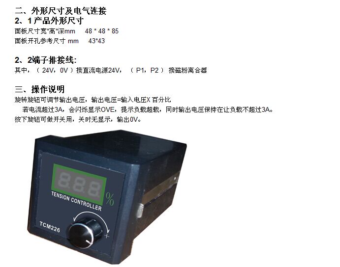 TCM226小型手动张力控制器就是在收卷或放卷过程中,当卷径变化到某一阶段,由操作者调节手动电源装置,从而达到控制张力的目的。不过现代凹印机手动张力控制系统已基本被淘汰,而仅仅作为闭环式全自动张力控制系统中的一种操作模式存在。